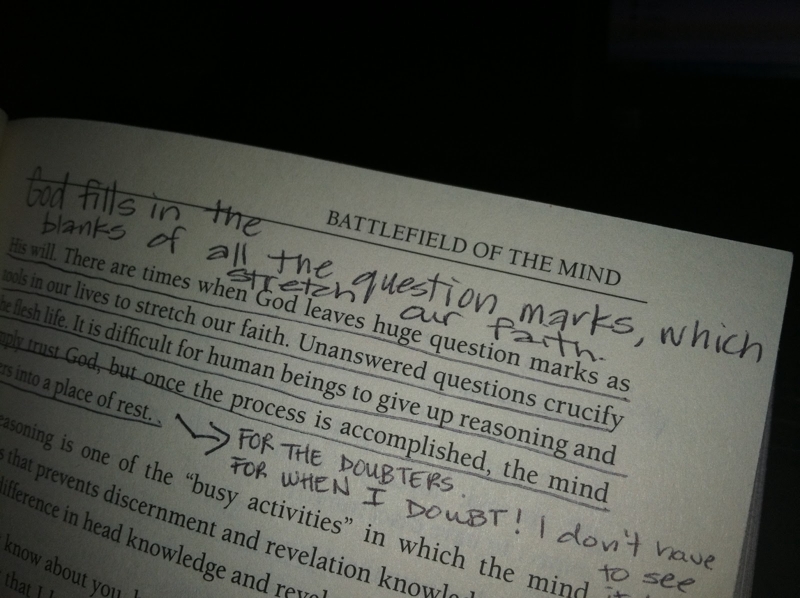 Faith... I am discovering more and more the importance of having spiritually knowledgeable in my life. This does not necessarily mean they can quote every verse of the Bible. This means that I understand people who have God at the core of their being. Tonight at small group was a great reassurance that I am not alone in my struggles in life. Tonight's focus was on a confused mind (guilty). A doubtful and unbelieving mind (guilty). An anxious and worried mind (guilty). While I know and understand I'm guilty of all of these things, I'm realizing the power God has in comforting me in these weaknesses. And I'm going to picture review of some key points from my reading (Joyce Meyer's The Mind is a Battlefield)and of the night's discussion:
